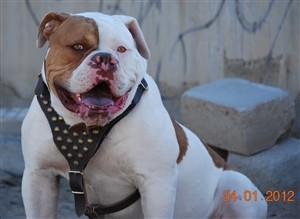 What a bold and striking dog harness... The breastplate of this dog harness is trimmed with brass studs.