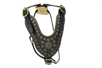 A sturdy and very high quality dog harness for the larger breeds. The large breastplate is decorated with brass studs and a large Viking hammered emblem. This dog harness is suitable for a real war dog! The breastplate is made of thick leather. The hardware is specially made in Switzerland and the leather comes from the best tanneries in the UK. Like all D & T products, the dog harness is guaranteed safe and comfortable for your dog. The harness has four adjustable straps of 30 mm width.