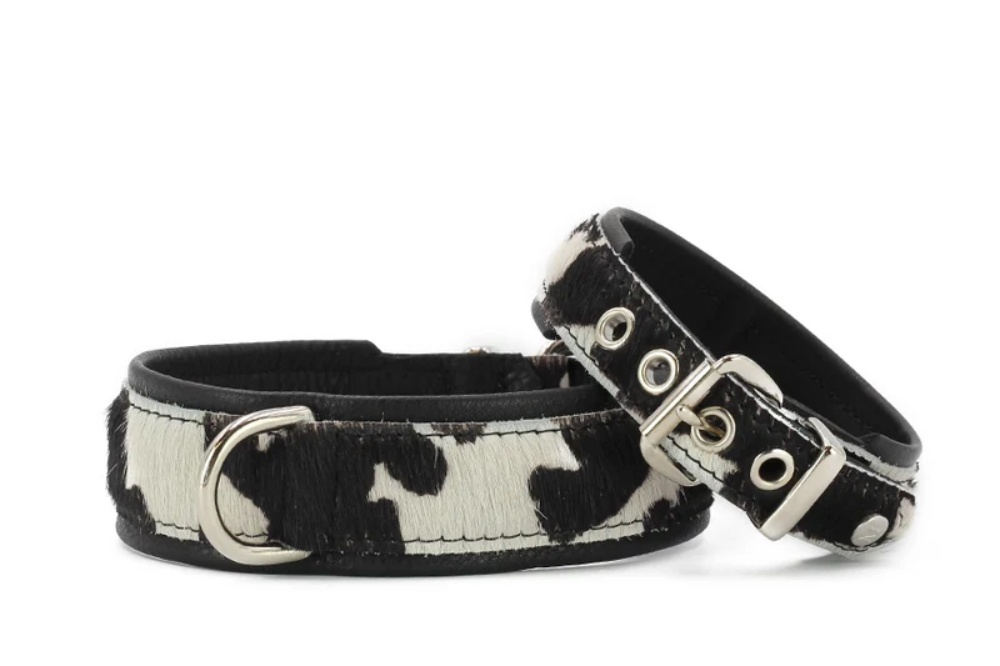 Each "Cowhide Collar" is unique thanks to the natural variations in the cowhide , meaning no two collars are exactly alike. This gives your dog an exclusive piece that emphasizes its individual character. The exterior of the collar is made of soft yet durable cowhide, while the interior is lined with high-quality nappa leather . This ensures optimal wearing comfort for your dog and prevents irritation to the neck.