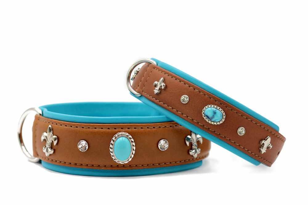 What makes the "Ibiza Collar" truly unique are its refined decorative elements. The collar features robust studs , imposing lilies, an elegantly inlaid cabochon stone, and sparkling crystals. These details give the collar a luxurious and distinctive look that will make your dog shine.