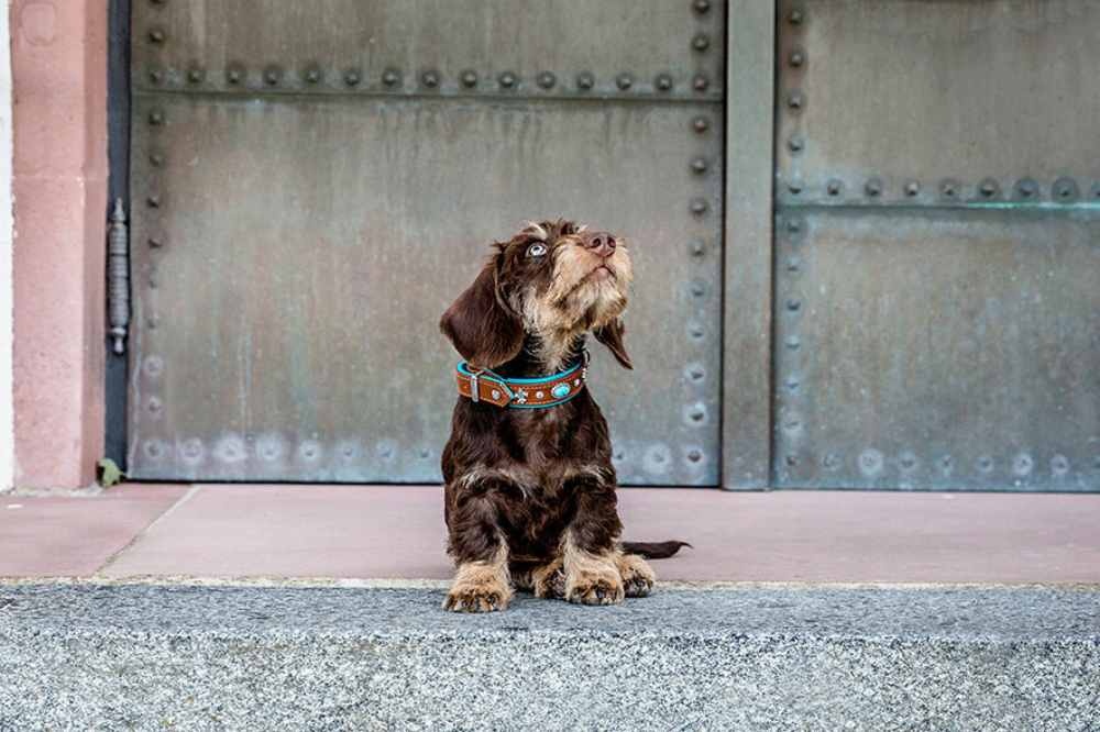 A beautiful cognac leather dog collar adorned with various ornaments. Available in many sizes. Handmade in Germany.
