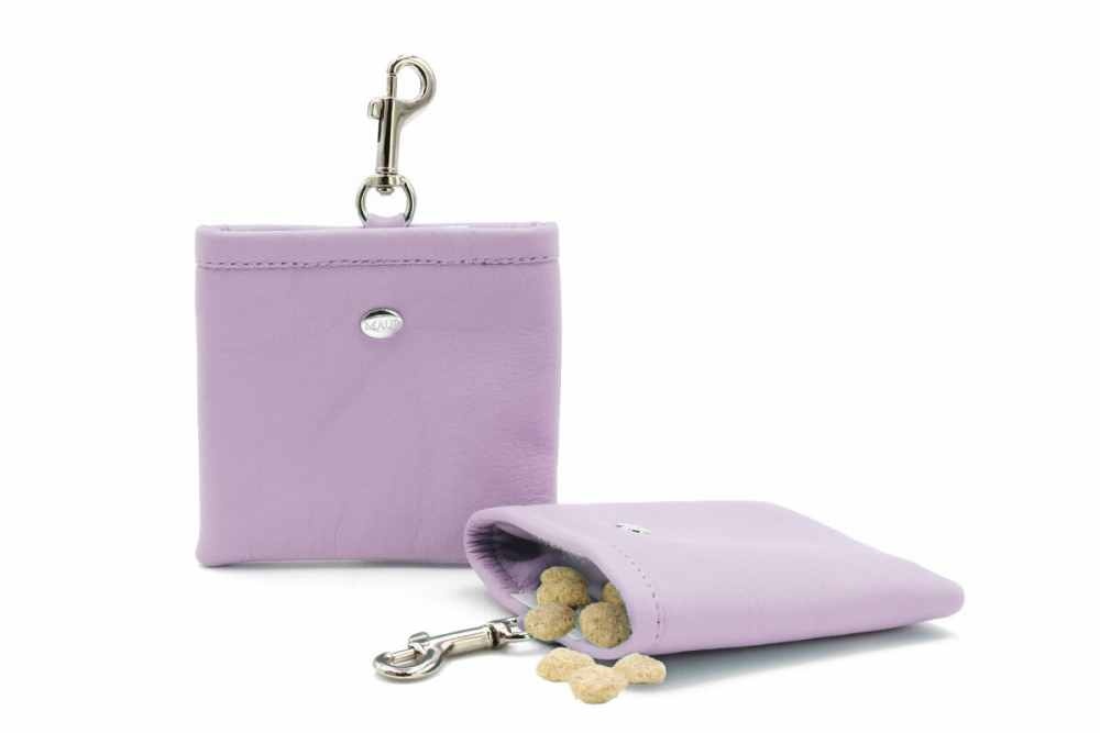 A beautifully handcrafted treat bag crafted from lilac nappa leather. The interior is lined with a waterproof fabric, making it easy to wipe away crumbs and debris. Dimensions: 11 x 11 cm.