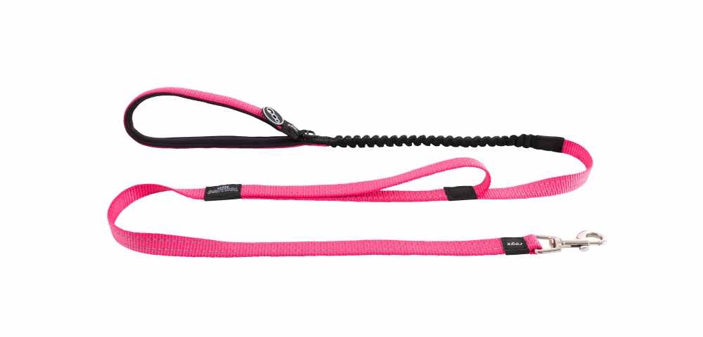 A sturdy plain pink nylon dog leash with a snap hook, provided with reflective stitching. The leash has an elastic band for shock absorption. Available in various sizes.