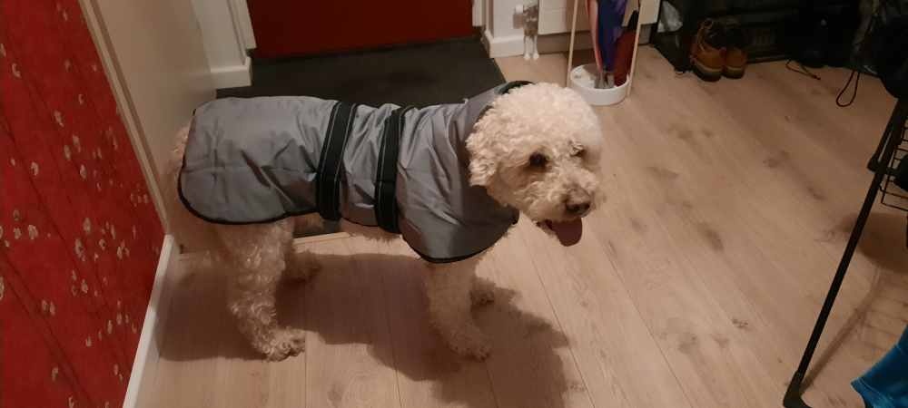 Een comfortabele waterafstotende, winddichte, grijze hondenjas met reflecterende biezen en een fleece voering.