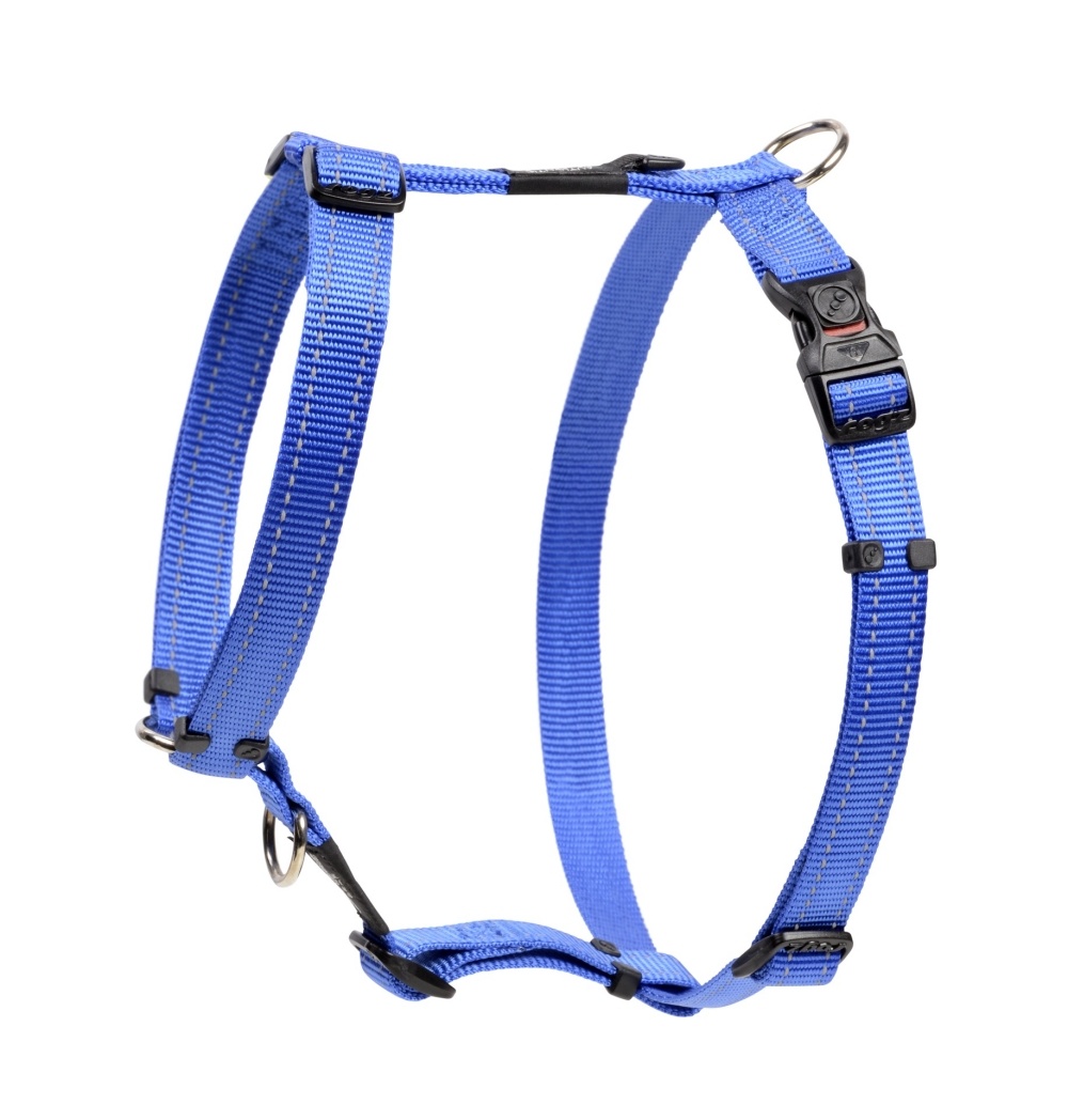 Een effen blauw, stevig nylon hondentuig, met een sterke kliksluiting, een uitstekende pasvorm en reflecterende stiksels. In diverse maten leverbaar.
