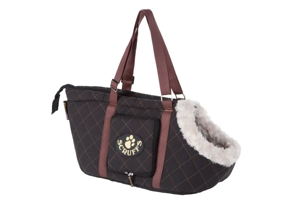 De hondentas is gemaakt van gewatteerde stof die aan de buitenkant gestikt is in een ruitpatroon. De binnenzijde is gemaakt van een pluche vacht, zodat uw huisdier er comfortabel in zal kunnen liggen.